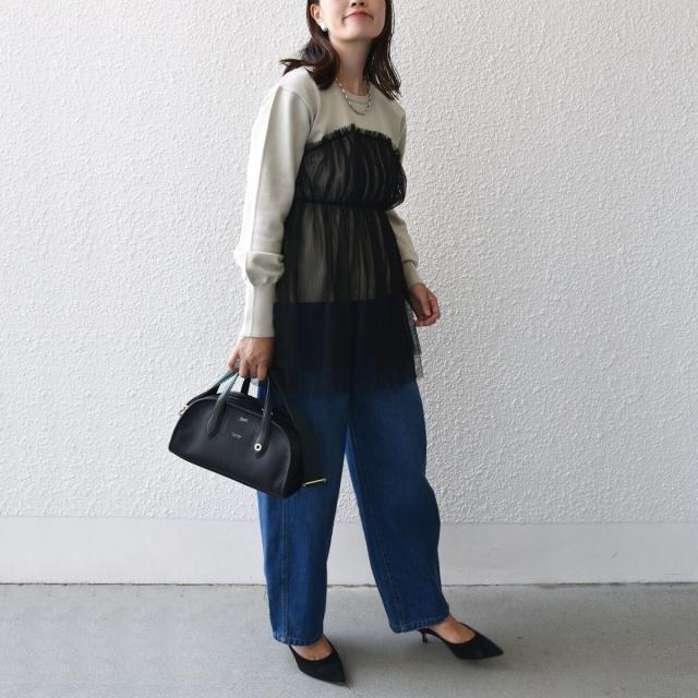 ・デニム×チュールの鉄板スタイルでカジュアルに、ブラックのスカートで合わせればシックな印象に◎