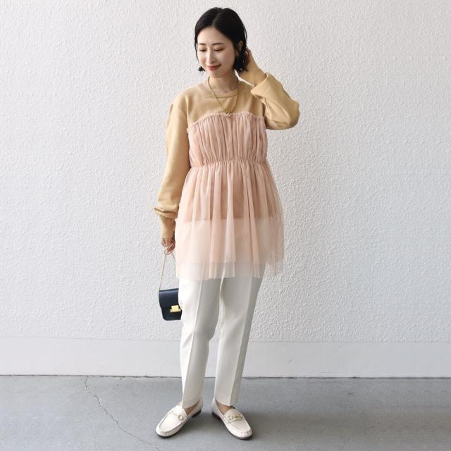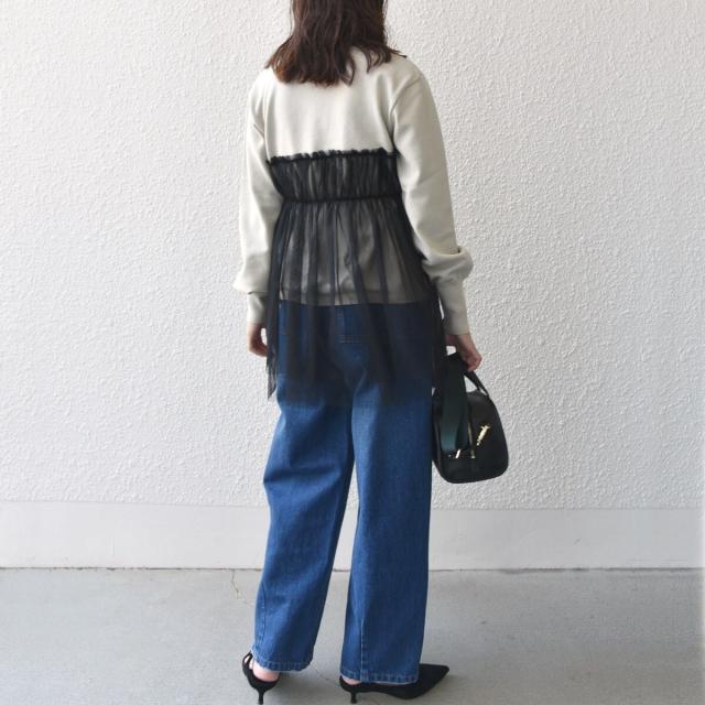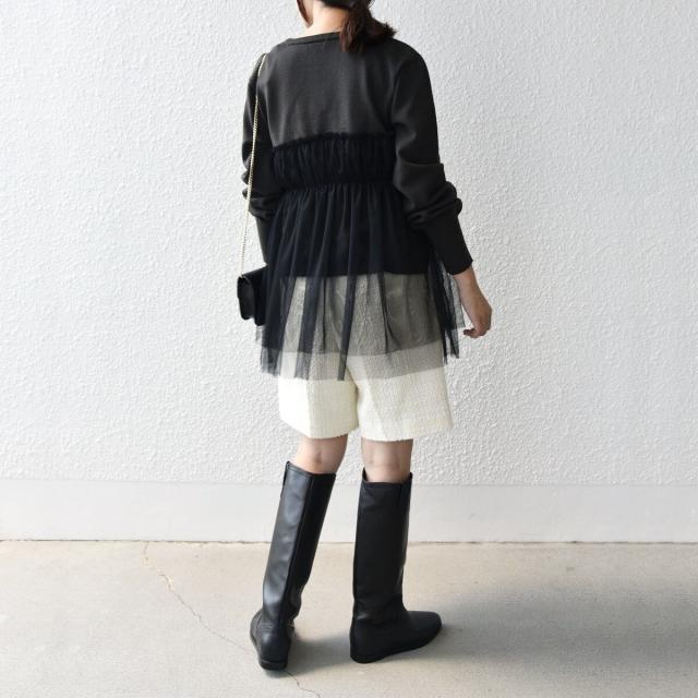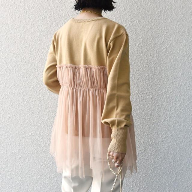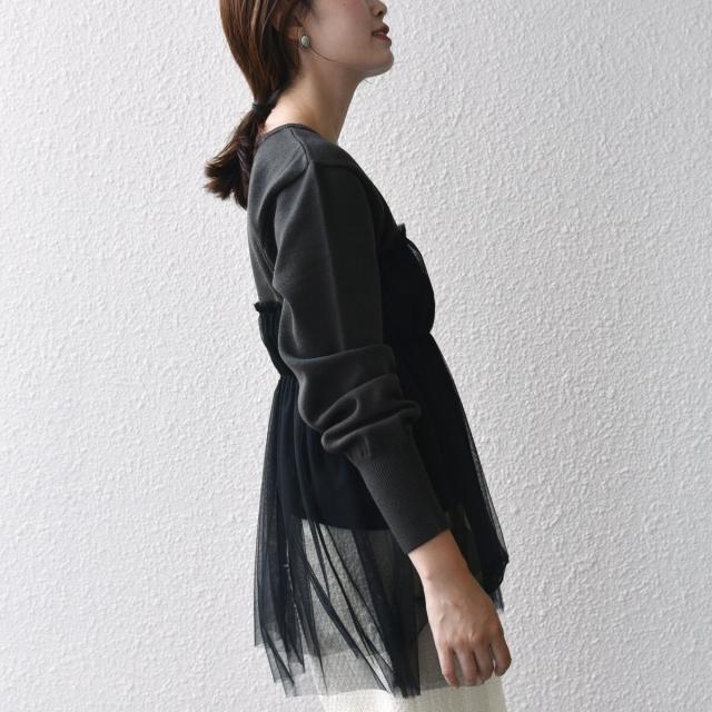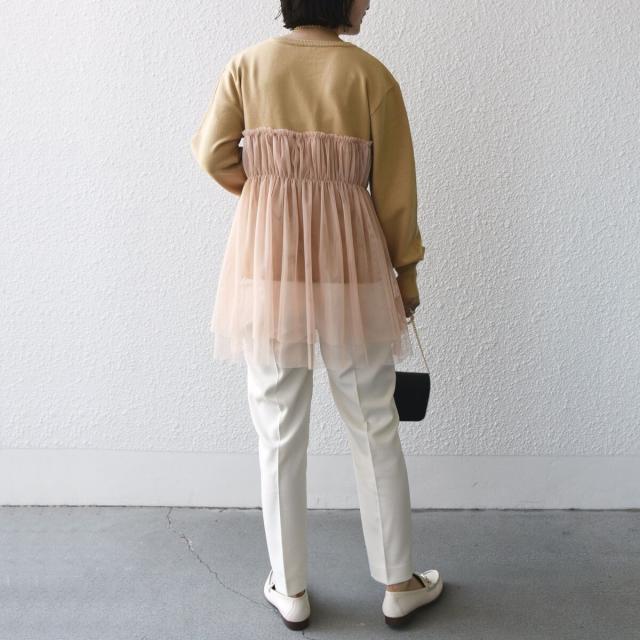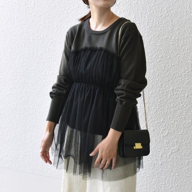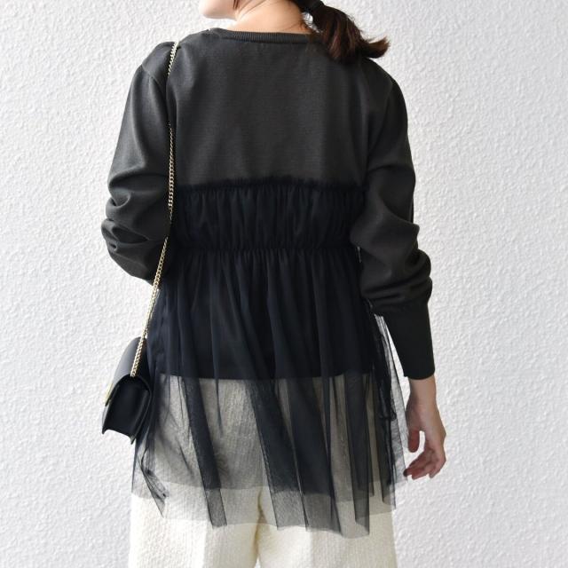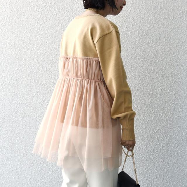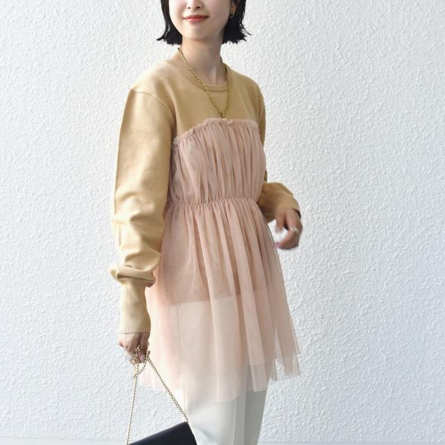 ・スウェット見えのニットに、シアー感が今の気分にぴったりなチュール素材をビスチェ風にドッキングしたプルオーバーです。