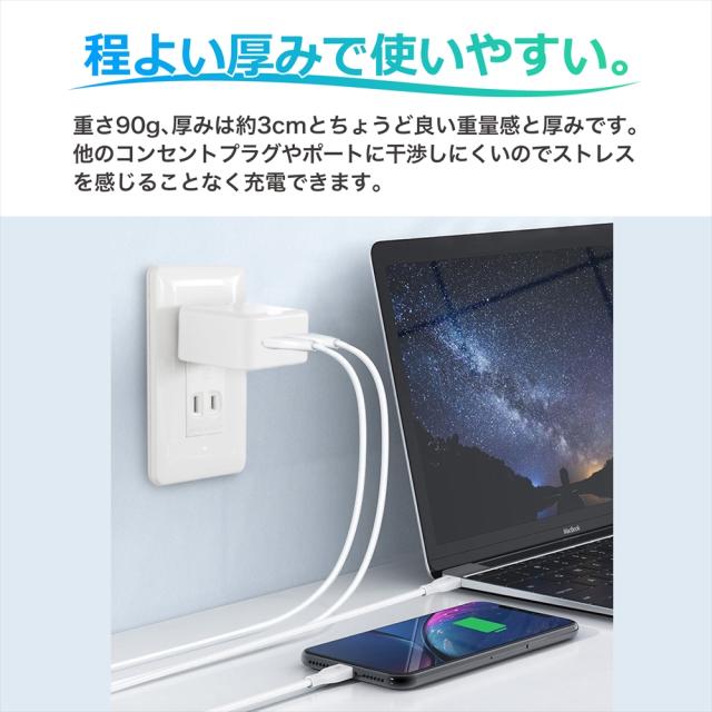| 【GaN採用】PD急速充電器 ACアダプター【USB-C×2ポート】 次世代半導体新素材「GaN(窒化ガリウム)」採用により、従来品に比べて電力損失と発熱量が小さくなり小型化・高効率化を実現。 【最大出力35W】 単ポート使用時では最大35Wの出力。 MacBookAirなど、PD対応の様々なノートPCにも充電可能。 スマートフォンからノートPC、iPadなどのタブレットまで幅広い機器に対応します。 【2ポート搭載で2台同時急速充電可能】 2台同時利用時は各ポート最大出力18W+15Wで合計33Wに対応。 スマホを2台同時に急速充電可能。 iPhoneならPDに対応したiPhone8以降のモデルをおよそ30分で約50%まで急速充電することができます。 【PD急速充電対応】 USB C Power Delivery 3.0(パワーデリバリー3.0)急速充電対応。 【軽量・コンパクト】 重さわずか90gの軽量・コンパクト。 折りたたみ式プラグ搭載でコンセントまわりもスッキリし、持ち運びにも便利です。 【ご注意】 ※お使いの端末すべてに最大出力での充電を保証しておりません。 ※急速充電を利用するには、ご使用の機器とケーブルがPD規格に対応していることが必要です。 >>PD対応のType-Cケーブル付きも販売中! こちらから<< |