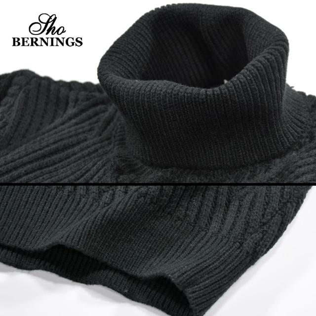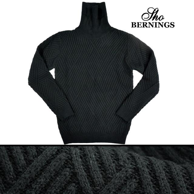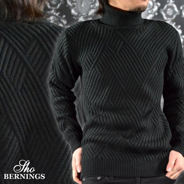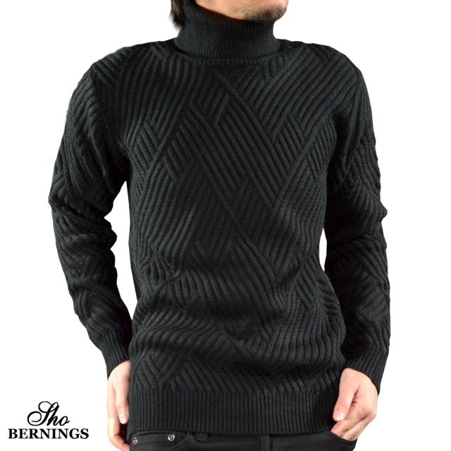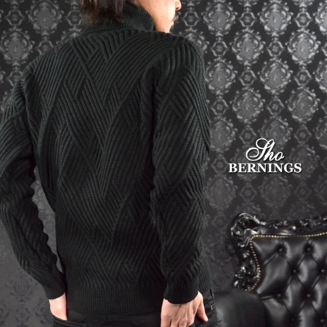 タートルネック リブニット ざっくり メンズ リブ 幾何学 ジグザグ ハイネック セーター(ブラック黒) 423633