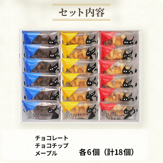 商品名 【お歳暮】イーペルの猫祭り ベルギーミニワッフル YJ-BWW 容量 メープル、チョコレート、チョコチップ×各6個(計18個) 原材料名 【メープル】小麦粉(国内製造)、マーガリン、砂糖、卵、加糖練乳、メープルシュガー、イースト、牛乳、バター、食塩、はちみつ/乳化剤、着色料(カラメル、カロテン)、香料、膨張剤、(一部に小麦・卵・乳成分・大豆を含む)