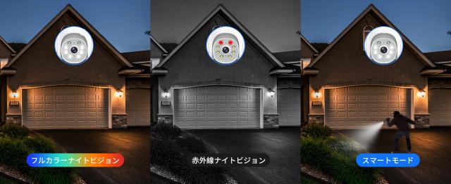 夜で常に黒白映像で、動体検知すると、カメラのライトを光りしてフルカラー映像になります。また、不審者を威嚇したりすることができます。