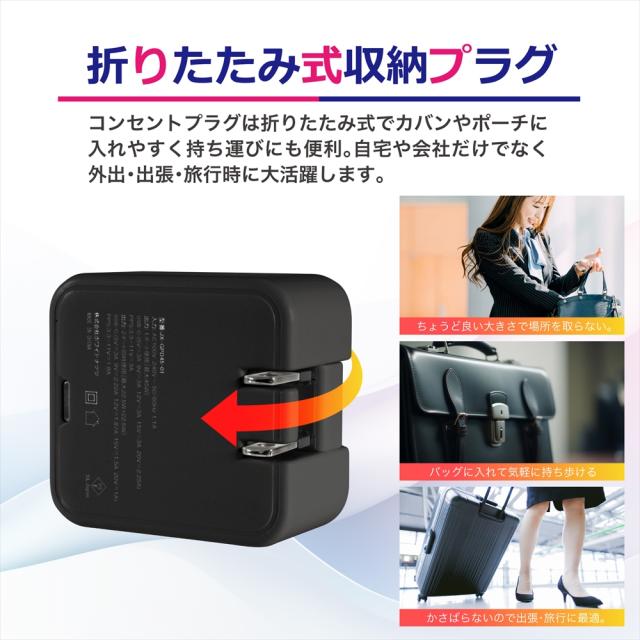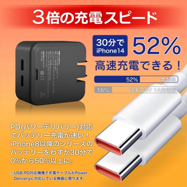 | 【GaN採用】PD急速充電器 ACアダプター【USB-C×2ポート】 次世代半導体新素材「GaN(窒化ガリウム)」採用により、従来品に比べて電力損失と発熱量が小さくなり小型化・高効率化を実現。 【最大出力45W】 単ポート使用時では最大45Wの出力。 MacBookAirなど、PD対応の様々なノートPCにも充電可能。 スマートフォンからノートPC、iPadなどのタブレットまで幅広い機器に対応します。 【2ポート搭載で2台同時急速充電可能】 2台同時利用時は各ポート最大出力22.5Wで合計45Wに対応。 スマホを2台同時に急速充電可能。 iPhoneならPDに対応したiPhone8以降のモデルをおよそ30分で約50%まで急速充電することができます。 【PD急速充電対応】 USB C Power Delivery 3.0(パワーデリバリー3.0)急速充電対応。 【軽量・コンパクト】 重さわずか90gの軽量・コンパクト。 折りたたみ式プラグ搭載でコンセントまわりもスッキリし、持ち運びにも便利です。 【ご注意】 ※お使いの端末すべてに最大出力での充電を保証しておりません。 ※急速充電を利用するには、ご使用の機器とケーブルがPD規格に対応していることが必要です。 >>PD対応のType-Cケーブル付きも販売中! こちらから<< |
