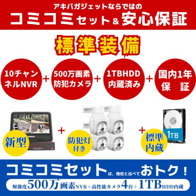 防犯カメラ 屋外 セット 家庭用 有線 poe給電 監視カメラ PTZカメラ 4台セット 10インチ モニター 500万画像 防犯灯付き 動体検知 AI追跡 常時録画 遠隔監視