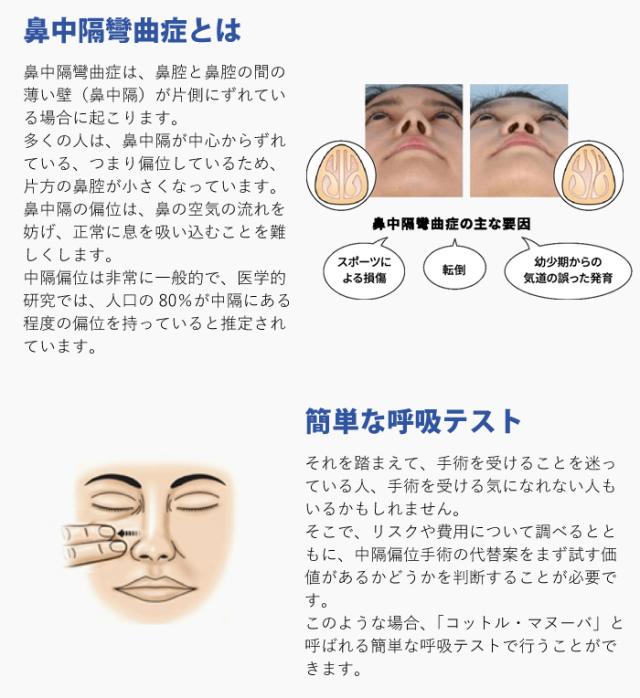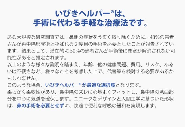| 使用方法 | (1)ご使用前に本品と手が清潔であることを確認してください。 (2)本品中央部を持ち、ゆっくり鼻腔に挿入します。初回は正しく装着するために鏡等で確認しながら挿入することをおすすめします。装用に慣れるまで約2週間が目安です。 (3)本品中央部(コネクティングブリッジ)を鼻中隔に合わせます。 (4)ご使用後は清潔な流水等で洗い、自然乾燥後、清潔に保管してください。 |