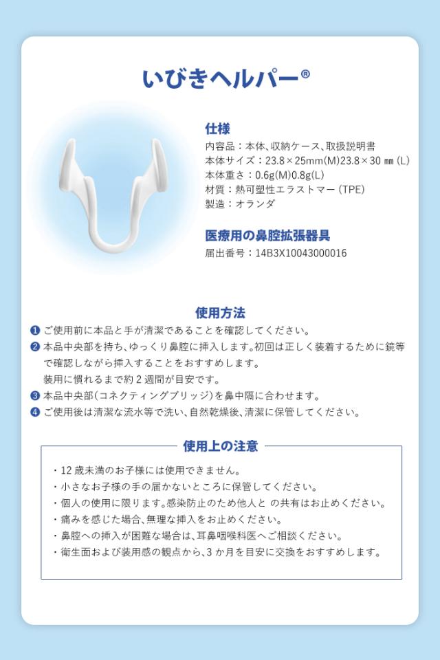 | 使用上の注意 | ・12歳未満のお子様には使用できません。 ・小さなお子様の手の届かないところに保管してください。 ・個人の使用に限ります。感染防止のため他人と の共有はお止めください。 ・痛みを感じた場合、無理な挿入をお止めください。 ・鼻腔への挿入が困難な場合は、耳鼻咽喉科医へご相談ください。 ・衛生面および装用感の観点から、3か月を目安に交換をおすすめします。 |
