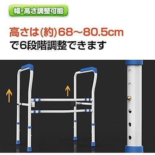 【調節可能】ご利用者様の身長や、便器のサイズに合わせて幅・高さが調節可能です。パイプにある穴に合わせてボタンを押し込むと、高さは6段階自由に調節、幅はピンを移動して調整・固定できます。