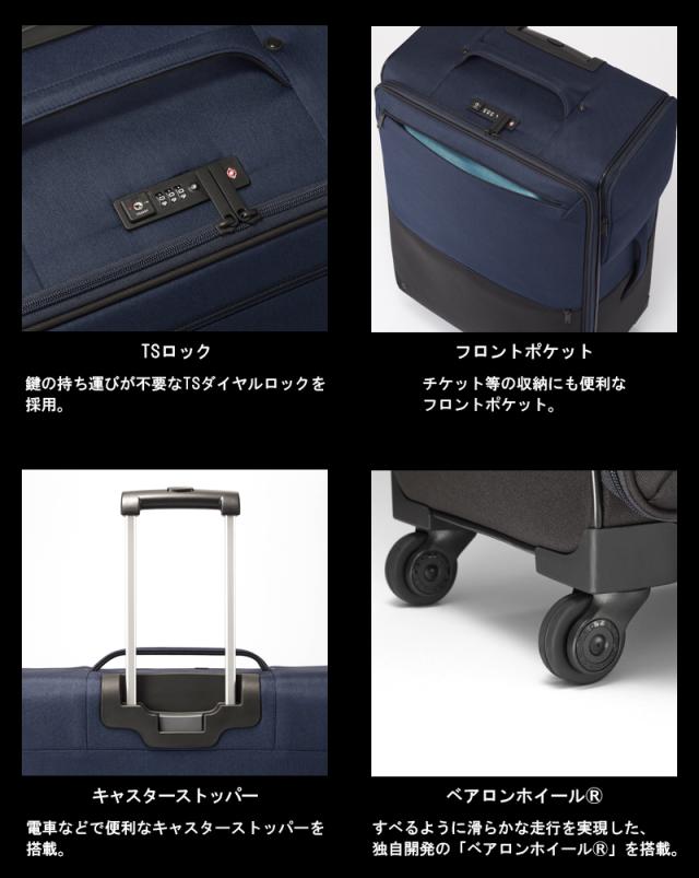機能一覧: 4輪/TSダイヤルファスナーロック/キャスターストッパー/国内線100席以上・国際機内持込み
