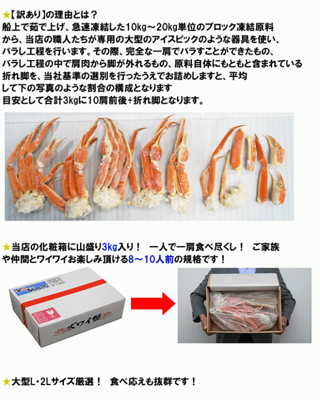 解凍後の重量に関しまして蟹はもともと水分が多い特性上、解凍後にNET重量から10%前後目減りすることがあります。予めご了承下さいますようお願い申し上げます。