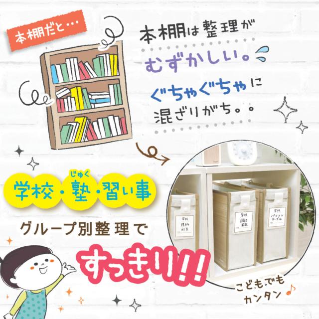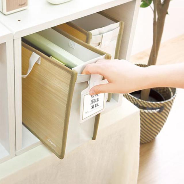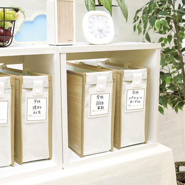 教科書やノート、ファイルや辞書など勉強に必要なものを、本棚に整理・整頓してきれいに保つことはなかなか難しいですよね。このバッグを使えば、学校・塾・習い事などの用途別や、教科別に分けて整理することですっきり片付きます。バッグの側面には、分類用のタグが付いているので、必要なものが一目で分かります。