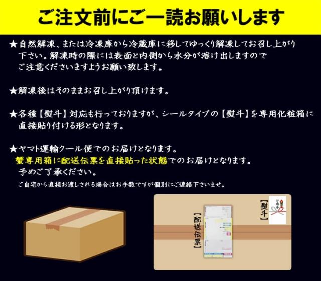 蟹はもともと水分が多い特性上、解凍後にNET重量から10%前後目減りすることがあります。予めご了承下さいますようお願い申し上げます。