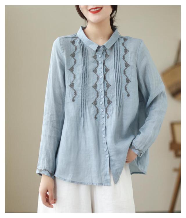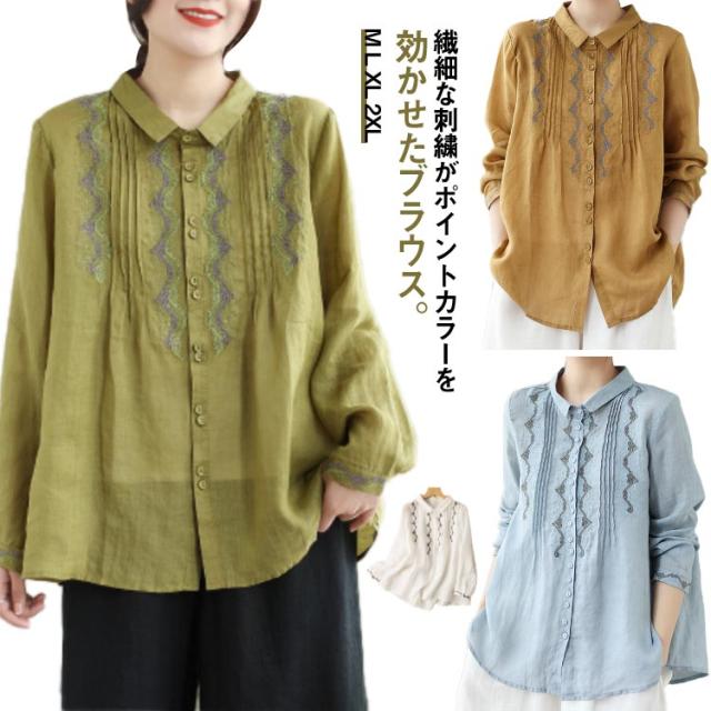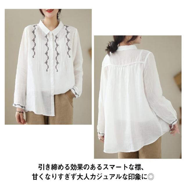 リネンシャツ 長袖 ブラウス チュニックシャツ 綿麻混 トップス 刺繍 刺繍ブラウス トップス 前開き リネン 麻 大人 薄手 ギャザー 可愛い 春夏 秋 新作 エスニック 体型カバー ゆったり Aライン