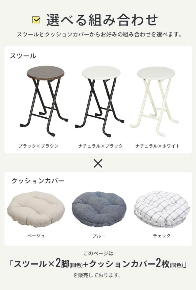 \折りたたみスツール同色2脚+丸椅子用クッションカバー同色2枚のセット/