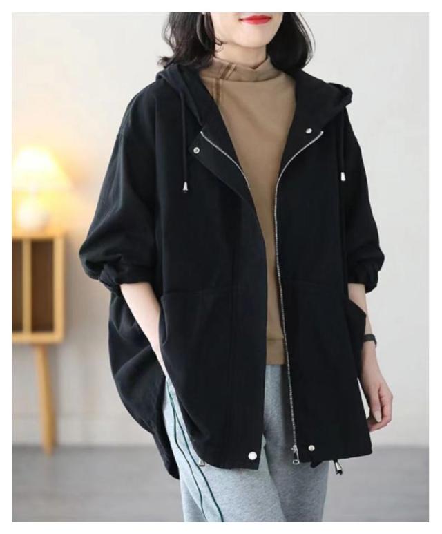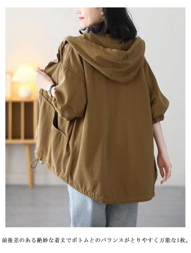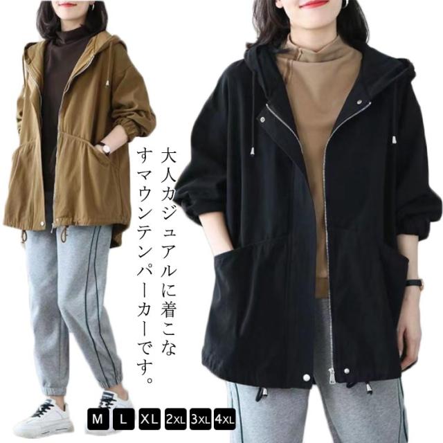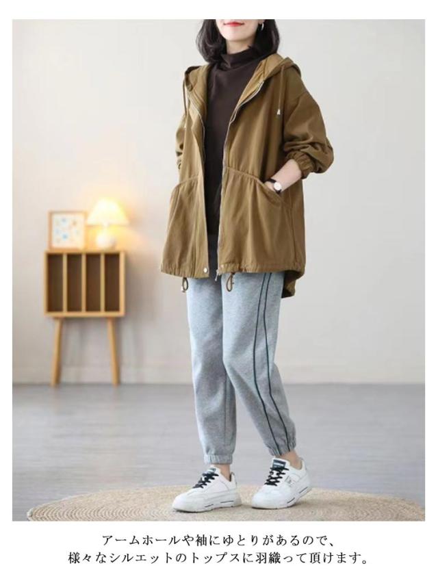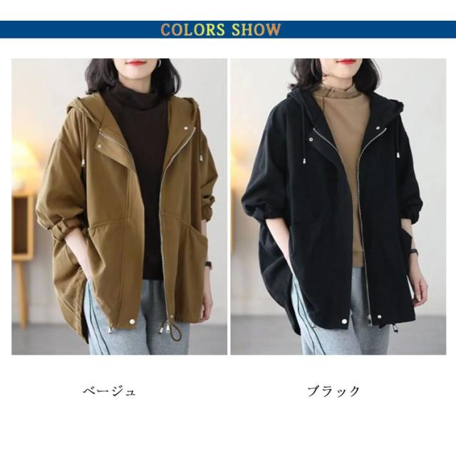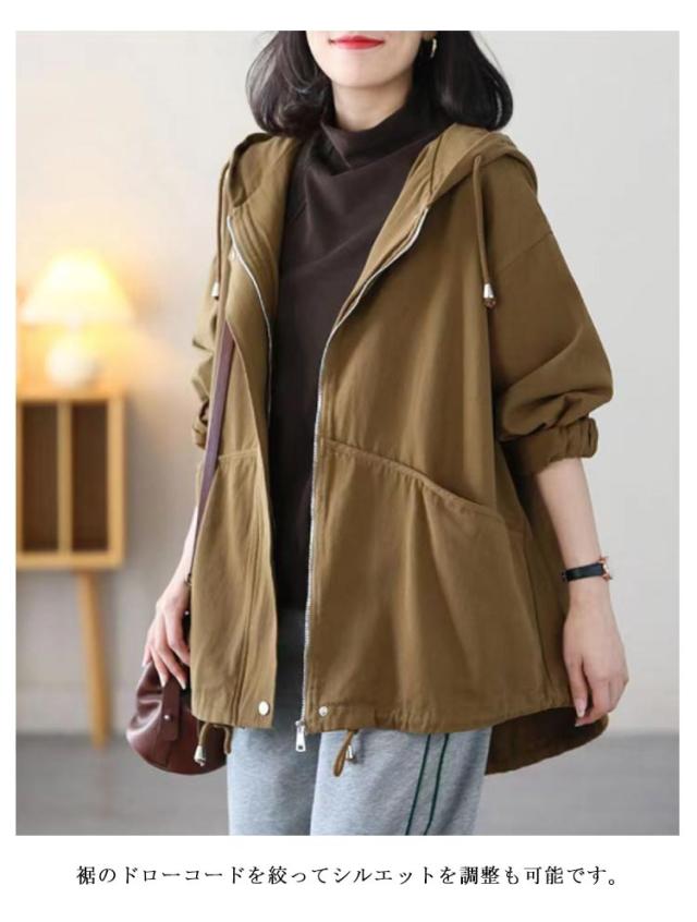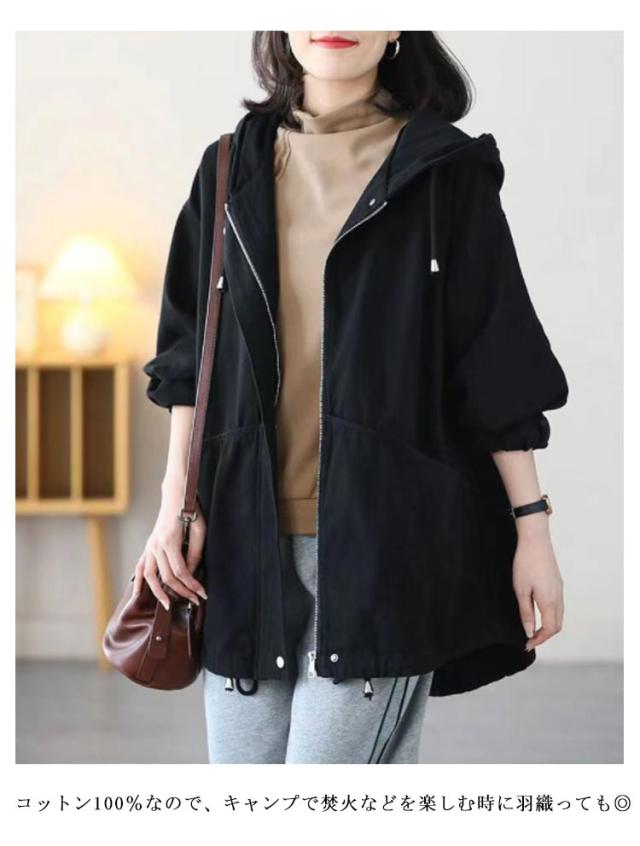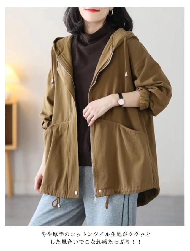 マウンテンパーカー レディース 秋アウター 綿 ツイル生地 モッズコート ミドル丈 ライトアウター コットン 裏地付き ゆったり 体型カバー フード付き 春 秋 ジャケット ブルゾン アウター 防寒 防風 ジップアップ パーカー 大人 カジュアル 【送無】