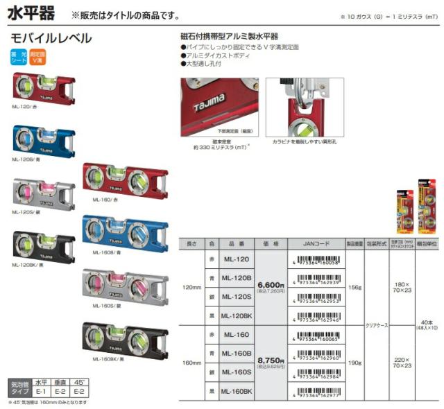 タジマ モバイルレベル 120 レッド ML-120 赤 長さ120mm 磁石付携帯型アルミ製水平器 TJMデザイン 160058 ネコポス可 ’