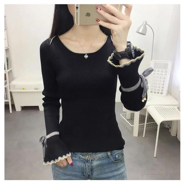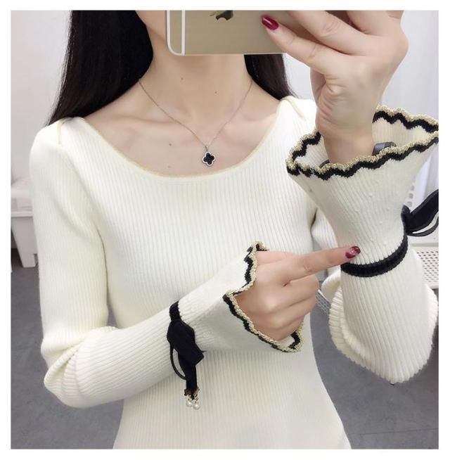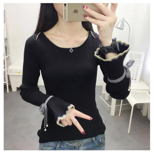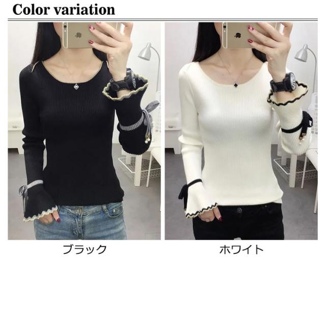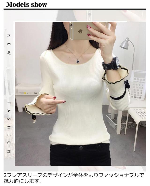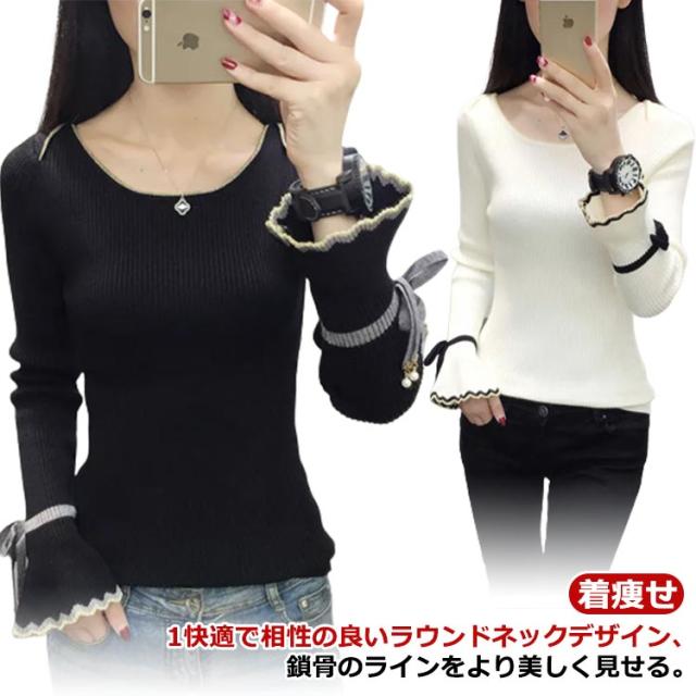 ニット トップス レディース 秋 冬 フレア袖 フレアスリーブ Uネック リブニット リブ ラウンドネック 着痩せ かわいい 大人可愛い シンプル きれいめ 送料無料