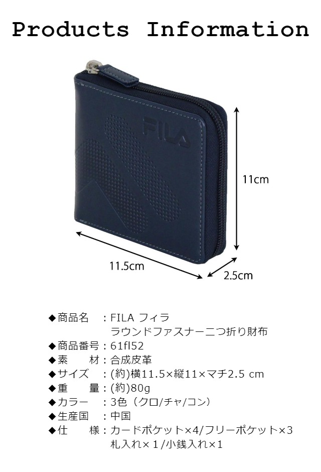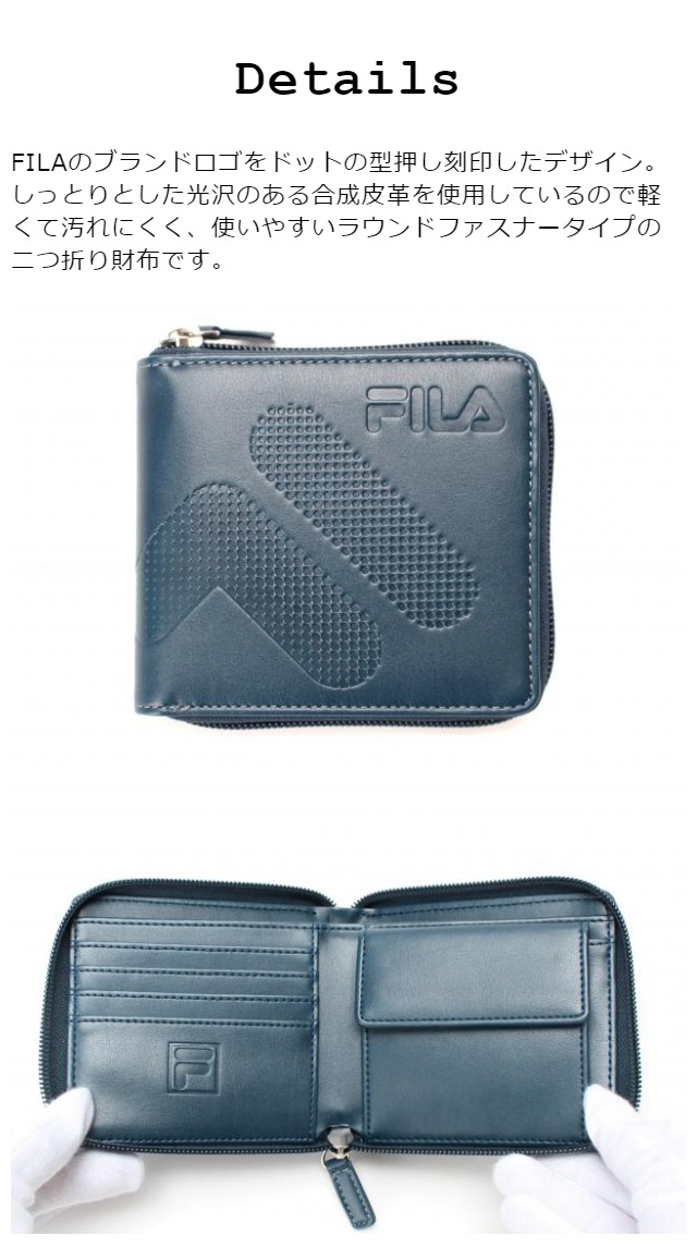 | ・FILAのブランドロゴをドットの型押し刻印したデザイン ・しっとりとした光沢のある合成皮革を使用しているので軽くて汚れにくく、使いやすいラウンドファスナータイプの二つ折り財布です。 |