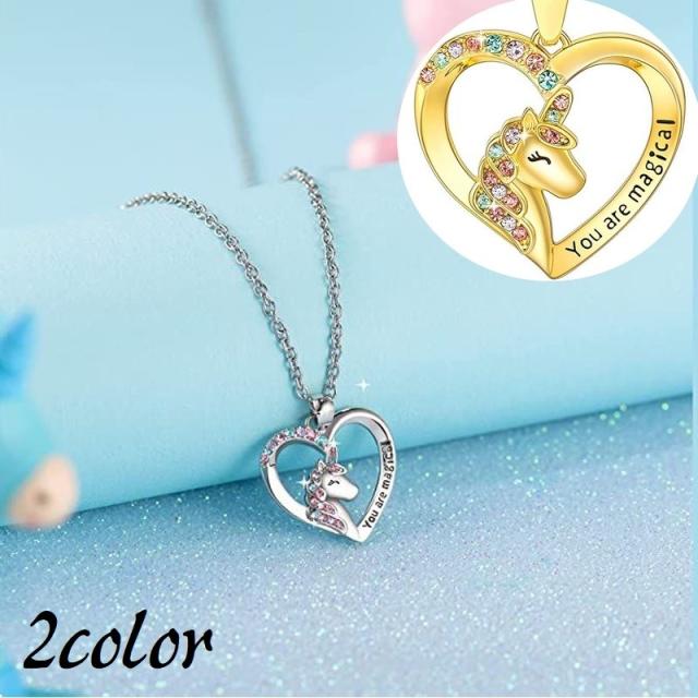 ネックレス ペンダント 首飾り レディース 女性 アクセサリー ファッション小物 ユニコーン ラインストーン ハート 英字入り