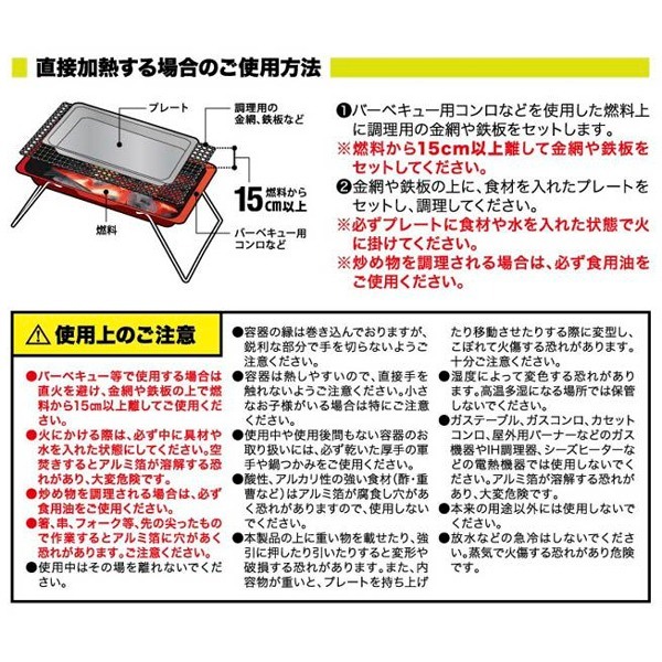 | ※ バーベキューなどで使用する場合は、直火を避け金網や鉄板の上に乗せて、燃料から15cm以上離してご使用ください。 ※ 火にかける際は、必ず中に具材や水を入れた状態にしてください。空焚きするとアルミが融解する恐れがあります。 ※ 炒め物の際は、必ず食用油をご使用ください。 ※ 酸性・アルカリ性の強いもの(酢・重曹など)はアルミが腐食する恐れがありますので使用しないでください。 ※ ガステーブルやガスコンロ、カセットコンロ、屋外用バーナーなどのガス機器は使用しないでください。 ※ IH調理機やシーズヒーターなどの電熱機器では使用しないでください。 ※ 食材や燃料は一切付属しません。別途ご用意ください。 ・ 掲載画像はイメージであり、実際の製品とは多少異なる場合があります。 ・ 製品の仕様は品質の向上・改善のため、予告なく変更となる場合があります。 | |