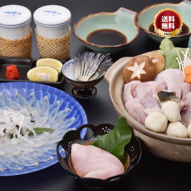 内容量:とらふぐ刺身 約60g、鍋用上身 約100g、鍋用アラ 約200g、とらふぐ白子約100g、ふぐ皮湯引き 約40g、ツミレ 4個、フグヒレ 2〜3枚、ポン酢、薬味