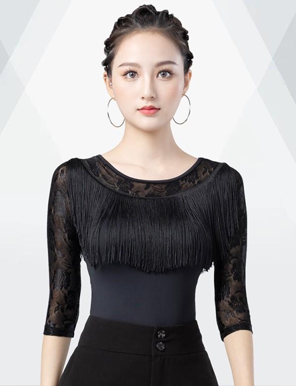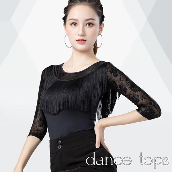 社交ダンス トップス 社交ダンス衣装 トップス フリンジ 大きいサイズ ダンス用シャツ レース 透け感 五分袖 ダンスTシャツ 社交ダンス ラテンダンス ダンスウェア 練習着 カラオケ衣装 レッスンウェア 黒as010s1s1l9