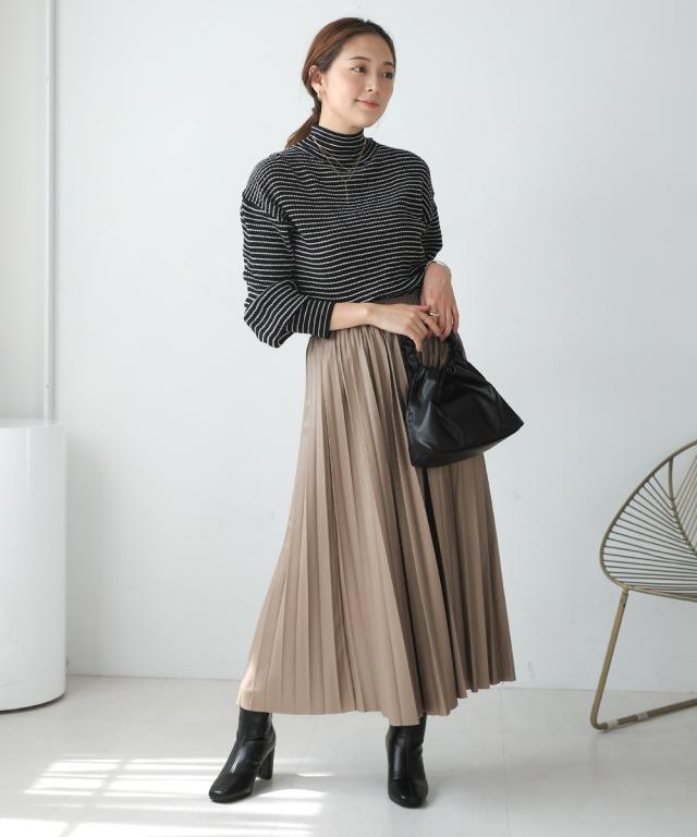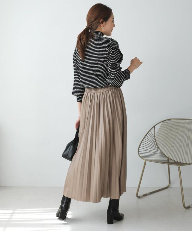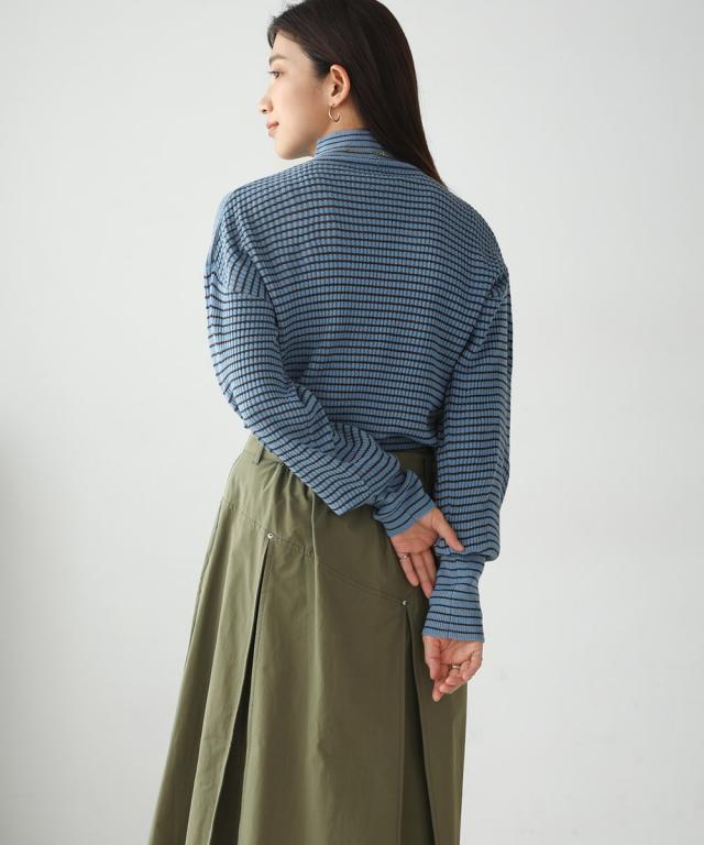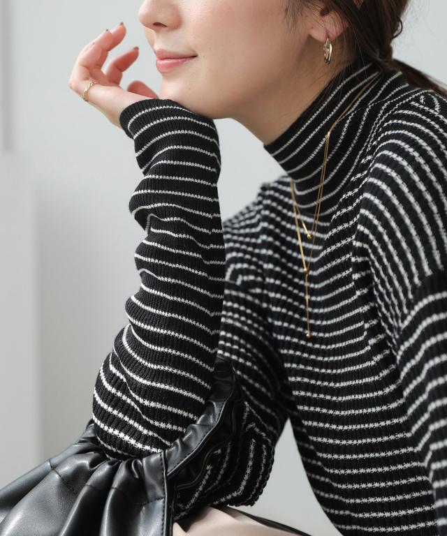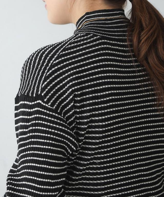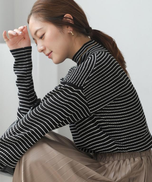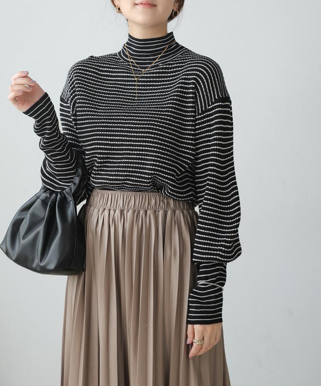 高すぎない程良いモックネックが首回りをスッキリと見せてくれる。デザイントップスは1枚でコーデの主役に、ベーシックなボトムと合わせてもコーデに華を持たせてくれます。これからのシーズンボトムインのコーデでも使いやすい。コートインで合わせて頂いてもごわつく事もなく着て頂ける所も嬉しいポイントです。