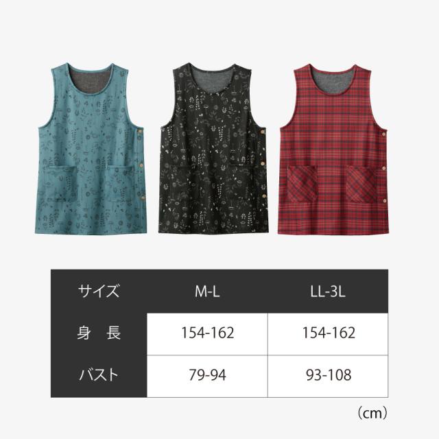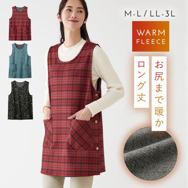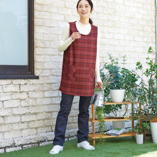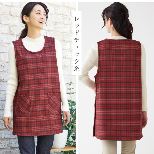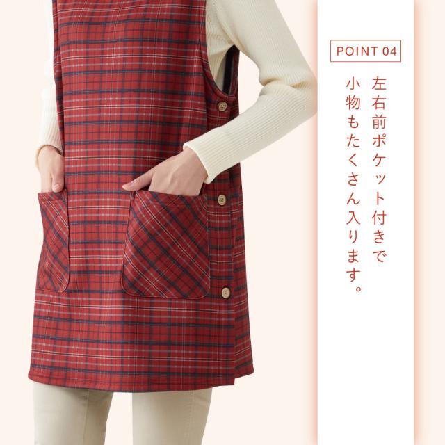エプロン レディース 冬 暖かい サイドボタン チュニック チュニックエプロン 赤 チェック 柄 軽くてあったかチュニックエプロン