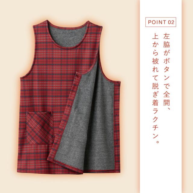 エプロン,レディース,サイドボタン,チュニック,チュニックエプロン,赤,チェック,柄,かぶるだけ,かぶる,袖なし,軽い,シャギー,ふわふわ,暖か,あたたかい,あったか,あったかグッズ,温め,温活,防寒,冷え症,対策,グッズ,冷え対策,寒さ対策,冷え取り,防寒グッズ,冷え対策,冷え性,冷え症,温活,秋冬,真冬,秋,冬,ポカポカ,ぽかぽか,お尻が隠れる,ポケット付き,ポケット,左右,両サイド,レッド,ブルー,青,チャコールグレー,おしゃれ,お洒落,オシャレ,大人,女性,女性用,婦人用,M,L,LL,大きいサイズ,大きめ,ゆったり,