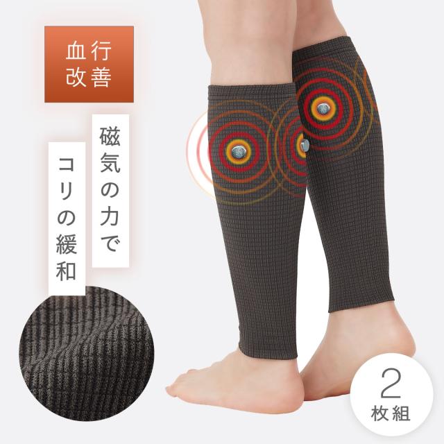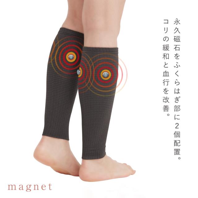 磁気の力でコリの緩和と血行改善!優しくケアするふくらはぎ用サポーター。永久磁石(ネオジウム磁石)をふくらはぎ部に2個配置。磁気の力で、コリの緩和と血行を改善します。