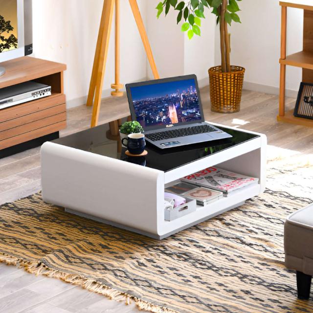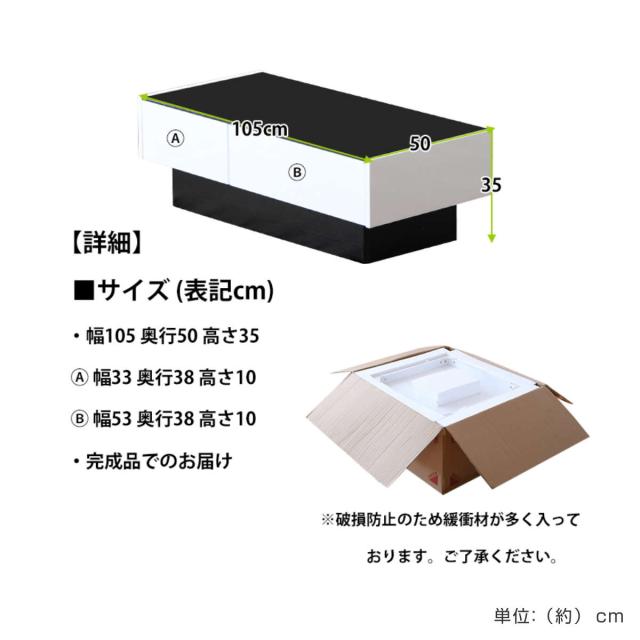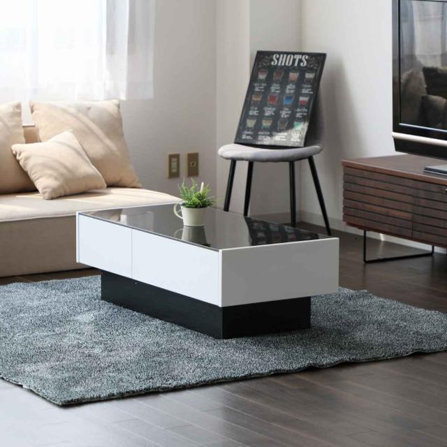 ローテーブル おしゃれ ガラス 大きめ 引き出し 幅105cm ( リビングテーブル センターテーブル ガラステーブル 収納 テーブル 完成品 天板 ブラックガラス スタイリッシュ 高級感 木目調 ホワイト 白 モノトーン )
