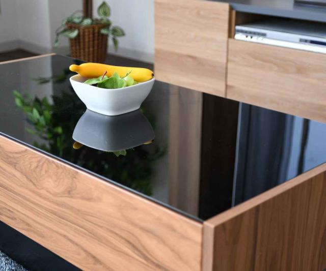 ブラックのガラス天板が映えるおしゃれなリビングテーブル