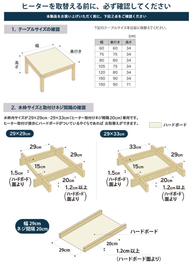 | ヒーター取付け木枠内サイズ | 29×29cm / 29×33cm / 幅 29cm 取付けネジ間隔 20cm |