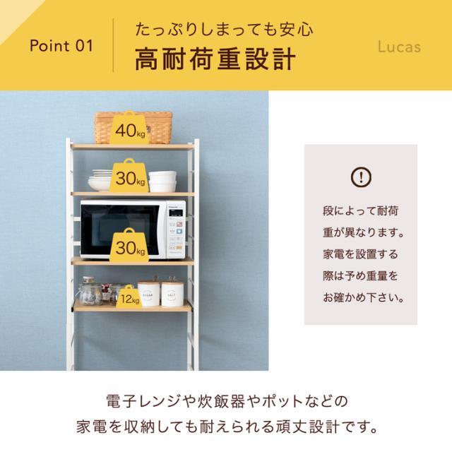 固定棚(最上段):約40kg、可動棚:約30kg、スライドトレー:約12kg