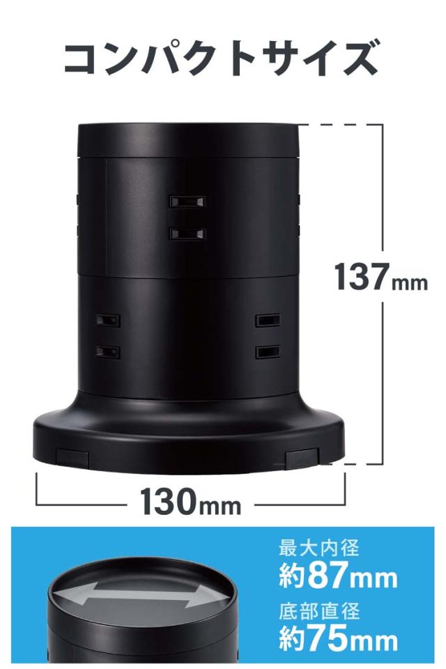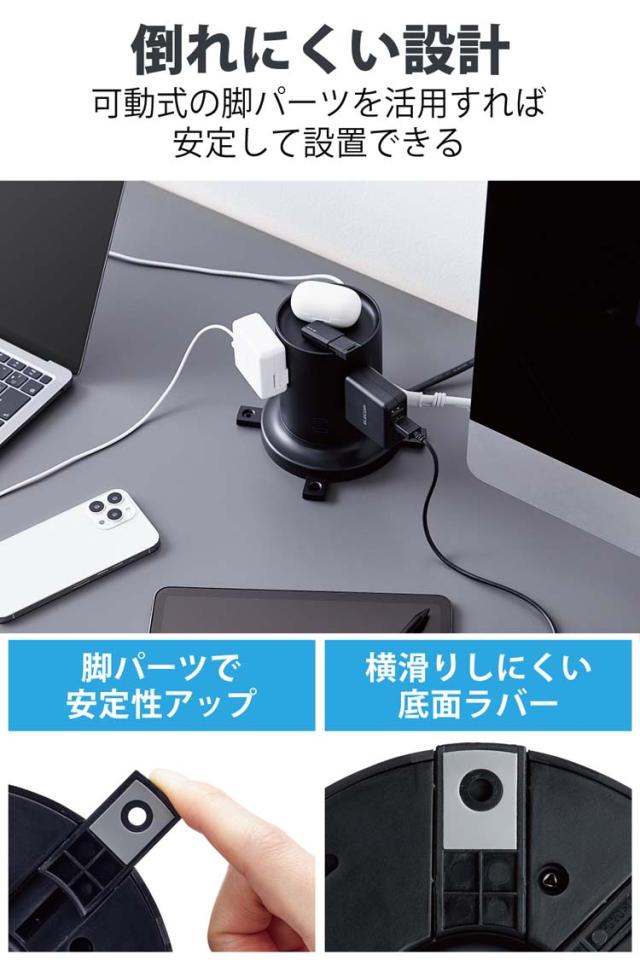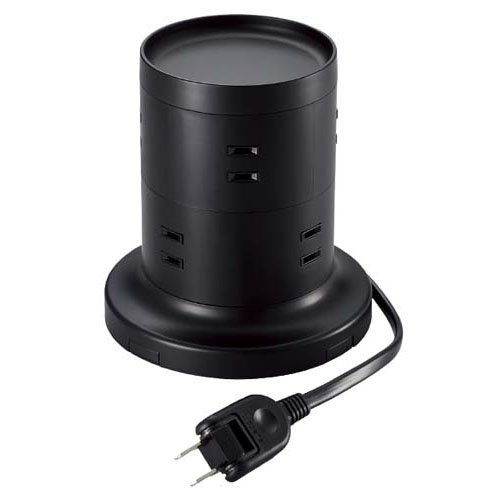 ●タワー型のため、差込口が多くても小さな面積で設置でき、360度あらゆる方向から接続できるので、会議室のデスクなどでの使用に便利です。