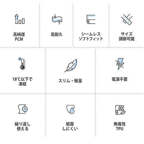 凍結状態で取り付けると温度を18℃前後に保ち、体温と-18℃差のひんやり感を楽しめます。