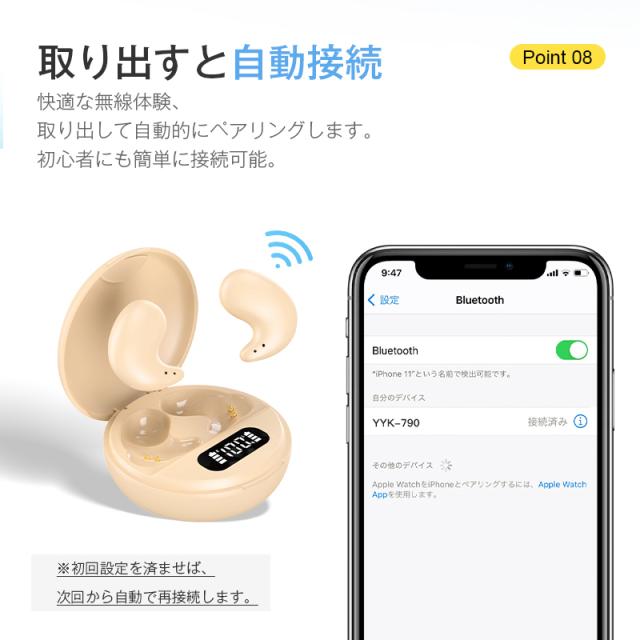 【完全ワイヤレス】完全ワイヤレスタイプだから、ケーブルが切れたり漏電したりする心配がなく、寝返りをうったり横になったりしやすいので寝ホンにぴったり。聴いている途中でそのまま寝てしまったとしても、ケーブルが首に巻き付いてしまう危険性がありません。