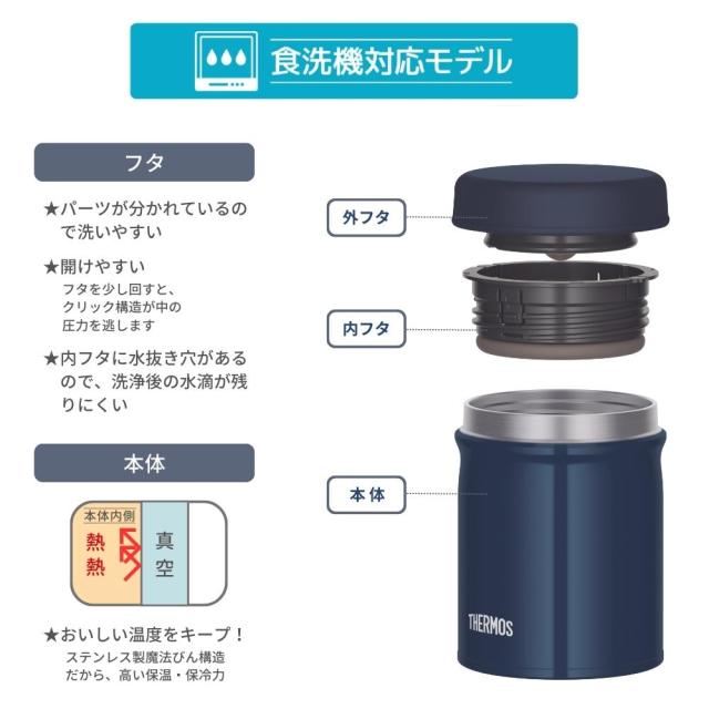 真空断熱スープジャーJEB-500は、食洗機対応で洗いやすい革新的なデザイン。
