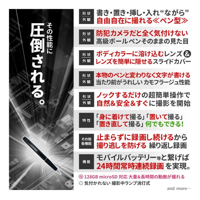 小型カメラ 隠しカメラ 防犯カメラ mc-p019 ペン型 カメラ 小型 レンズカバー搭載 簡単撮影 24時間連続録画 128GB対応 超小型隠しカメラ 防犯小型カメラ スパイカメラ 防犯camcam 防犯カムカム