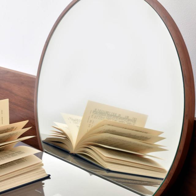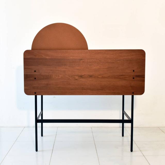 大きめのミラーは天板とバックパネルの隙間部分に立てかけるように設置します。取り外したり、左右に動かしたり使用しない場合は裏返しておくとこもできます。ミラー枠はウォールナット突板を使用しているので落ち着いた雰囲気に。