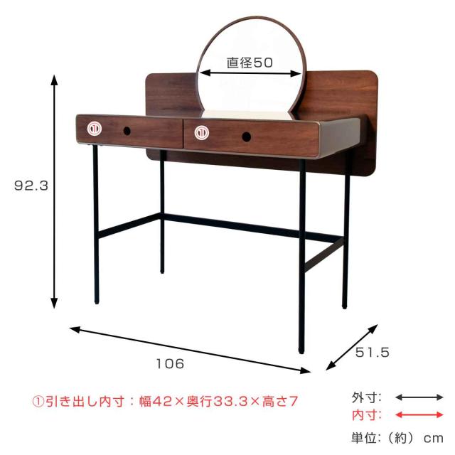 ドレッサー コンパクト デスク 引き出し 木目 配線穴 幅106cm ( 化粧台 メイク台 机 鏡台 おしゃれ 天板 くすみカラー 丸 ミラー 鏡 取り外し可能 ウォールナット スチール脚 レトロ モダン 北欧風 )