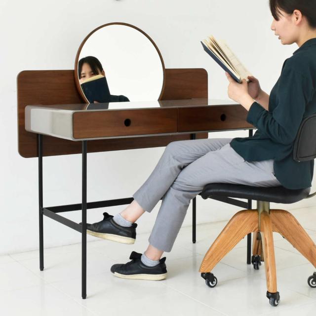 ドレッサー コンパクト デスク 引き出し 木目 配線穴 幅106cm ( 化粧台 メイク台 机 鏡台 おしゃれ 天板 くすみカラー 丸 ミラー 鏡 取り外し可能 ウォールナット スチール脚 レトロ モダン 北欧風 )