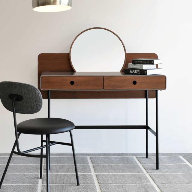 ドレッサー コンパクト デスク 引き出し 木目 配線穴 幅106cm ( 化粧台 メイク台 机 鏡台 おしゃれ 天板 くすみカラー 丸 ミラー 鏡 取り外し可能 ウォールナット スチール脚 レトロ モダン 北欧風 )