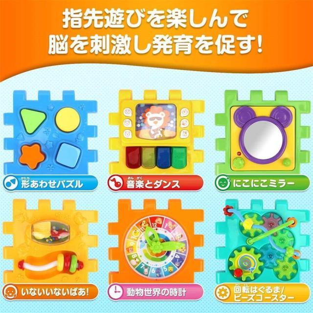 6面に12種の遊び: テーマが異なる6枚の手あそびパネルは、いろいろな遊び方がある:音楽とダンス、回転はぐるま/ビーズゴースター、形あわせパズル、動物世界の時計、にこにこミラー...テーマが異なる6枚の手あそびパネルは、1枚でじっくり遊んだり、ボックス型のまま楽しんだり! 自分の好きな色につなげたり、組み立てて遊ぶことも!工夫しながらお子さまの好奇心をグングンのばしましょう!