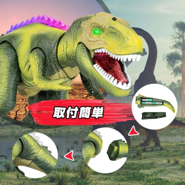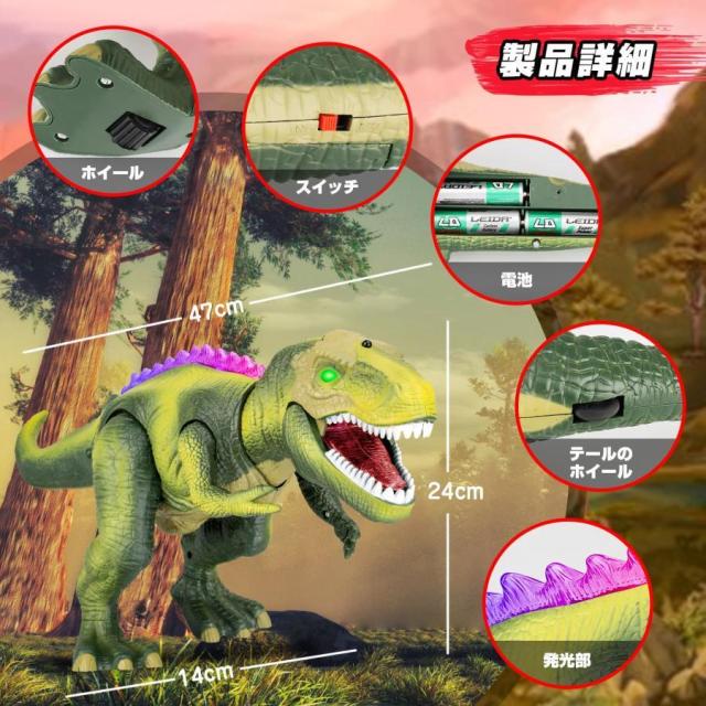 その振動機能も子供たちに本当の体験を与えることができます。T-Rexがウォーキング中、目は緑光を出し、口は青い光を出します。