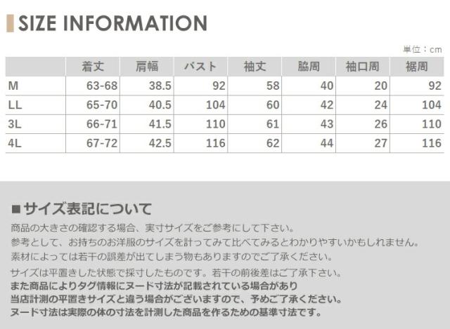 4L:着丈67-72 肩幅42.5 バスト116 袖丈62 脇周44 袖口周27 裾周116