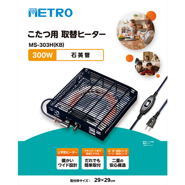 こたつ用 取替ヒーター MS-303H(KB) ■定格:AC100V 300W 50-60Hz ■発熱体:U字形石英管ヒーター ■安全装置:本体:温度ヒューズ/電源コード:電流ヒューズ ■重量:約1.0kg ■サイズ:幅28.8×奥行き28.8×高さ6.3cm ■温度調整:温調ツマミ無段階可変式 ■電源コード:丸打ちコードタイプ3m 電源スイッチ付 2PL ■ヒーター取付け 木枠内サイズ 29×29cm ■適合卓サイズの目安 〈最小〉60×60×34cm〜〈最大〉105×75×34cm ※旧型番:MS-400HS、MS-501HS、MS-301HS、MS-302HS、MS-300HS、MS-300HU、MS-303H(K)、MS-303H(KA) ※取替ヒーターをお買い上げいただく前に、「取替え前のこたつのサイズ」と「ヒーター取付け木枠サイズ」をご確認ください。 ※記載は商品仕様の一部です。仕様説明不足等の理由での返品はできません。特に適合等は必ずご確認ください。
