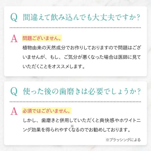 | 使用方法 | 歯磨きをする前に1包を手に取って封を開けます。液を口に含み、約10秒ほどゆすいでください。 |