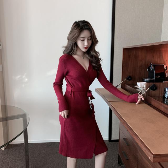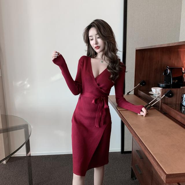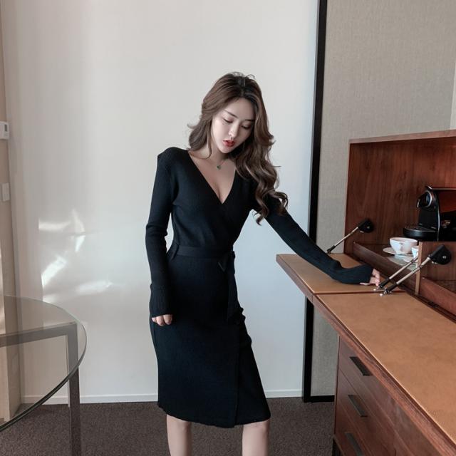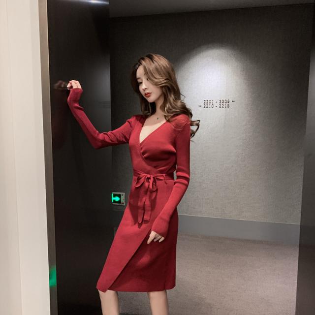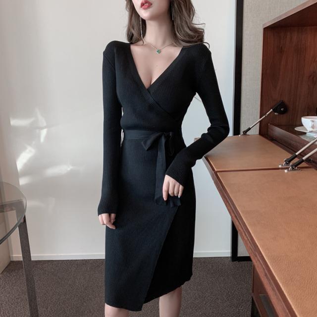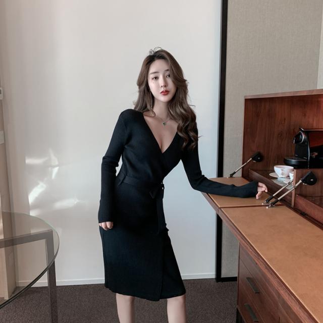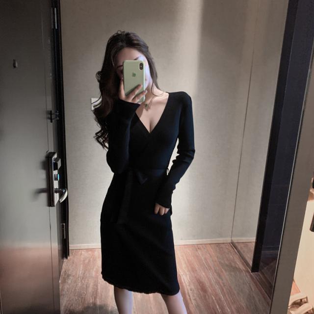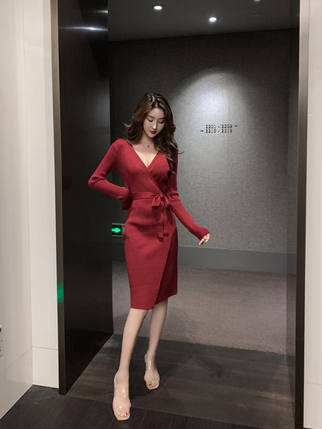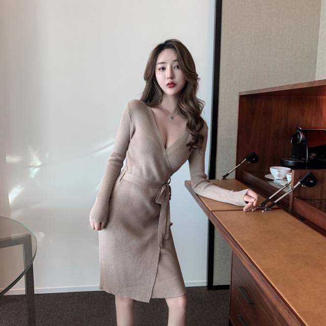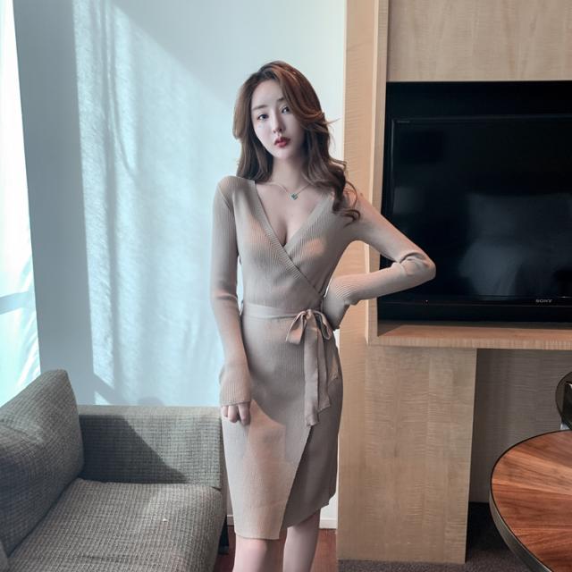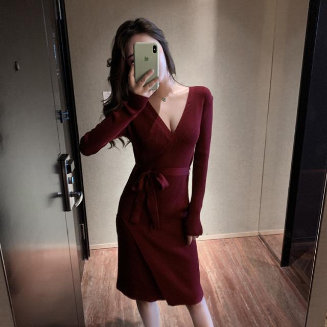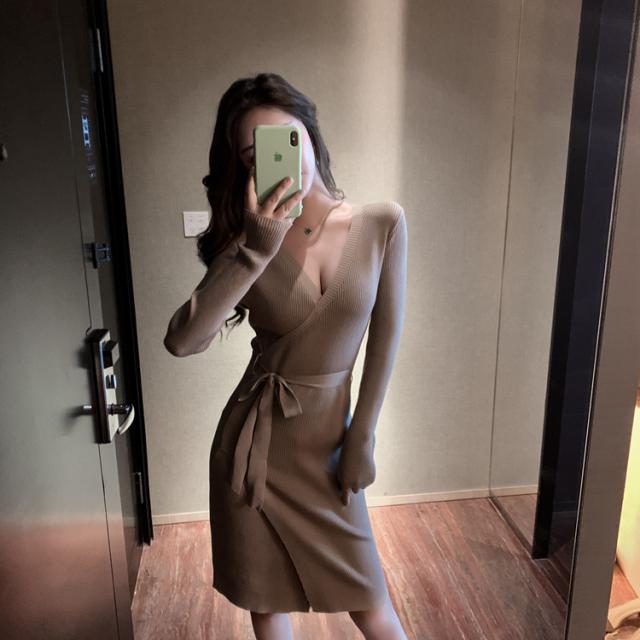 胸元がセクシーに空いたニットワンピ