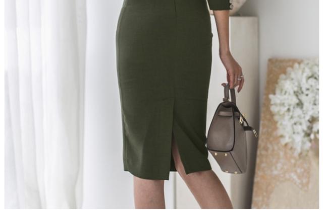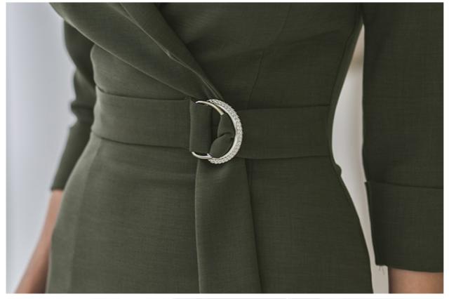 すっきりとしたカシュクールデザインが落ち着いた大人の女性にぴったりなミディアムワンピース。