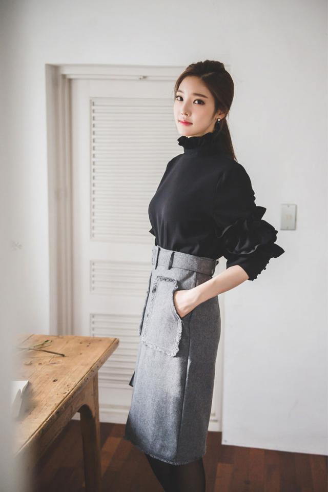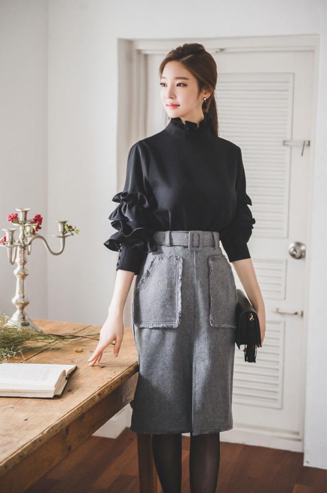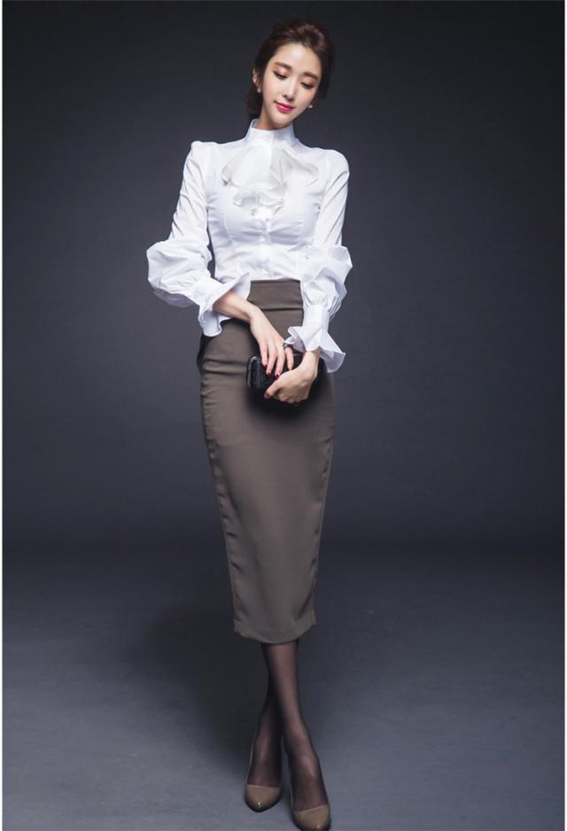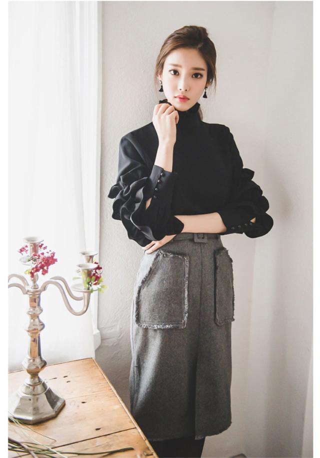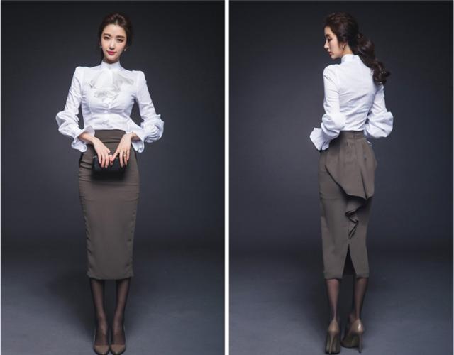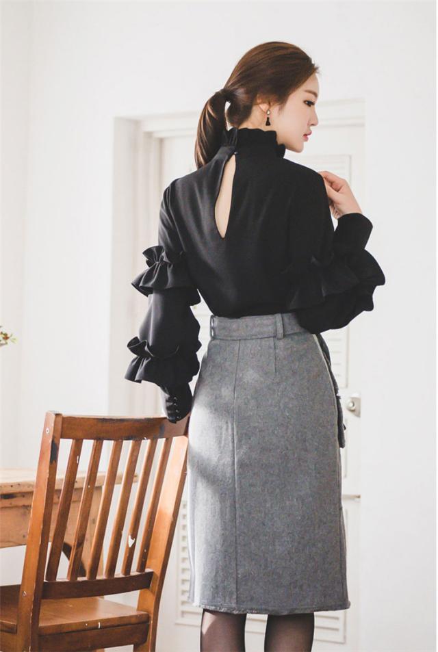 トップス ブラウス ミモレ丈 袖あり 長袖 スリム フリル スリット かわいい 大人可愛い きれいめ シンプル カジュアル 大人 上品 おしゃれ お洒落 レトロ 大人可愛い 大人女子 こなれ感 ラブリー キュート ガーリー 個性的 エレガント 主役級 存在感 フォーマル 無地 春 秋 冬